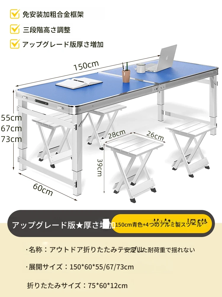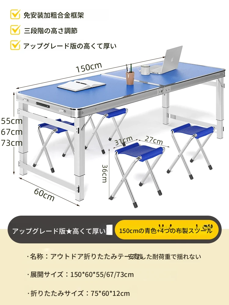 【アップグレード版★高さアップ・厚さアップ】150cmブルー+4アルミスツール