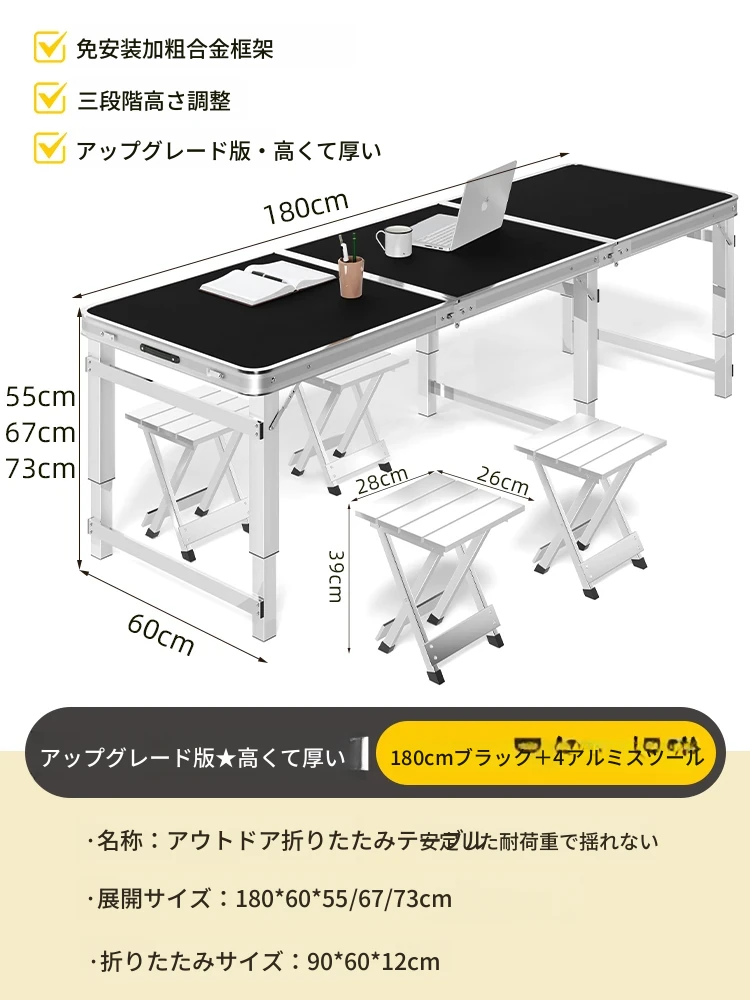 【アップグレード版★高さアップ・厚さアップ】180cmブラック+4アルミスツール