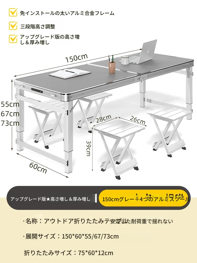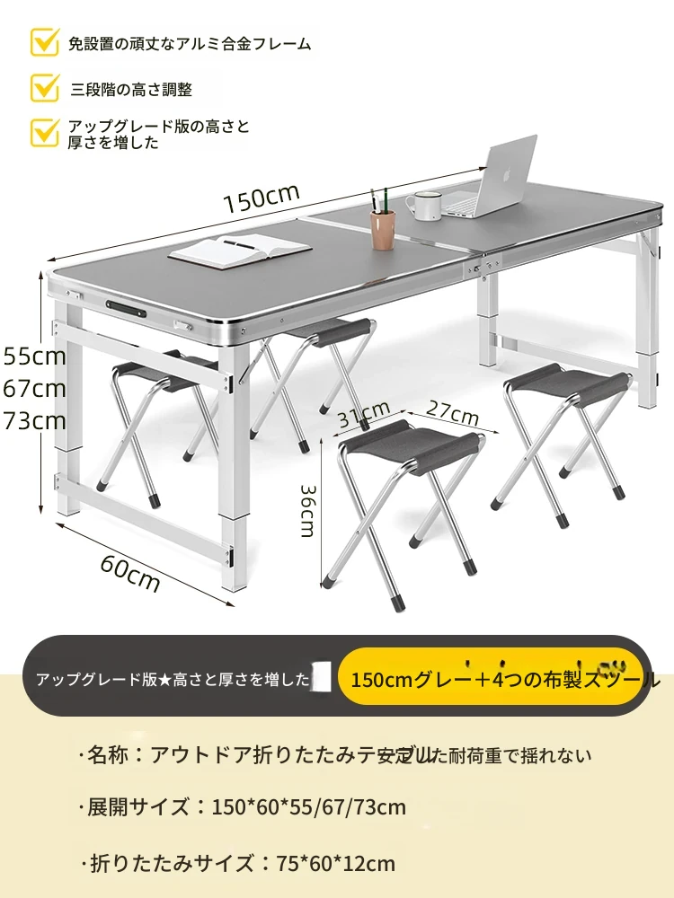 【アップグレード版★高さアップ・厚さアップ】150cmグレー+4アルミスツール