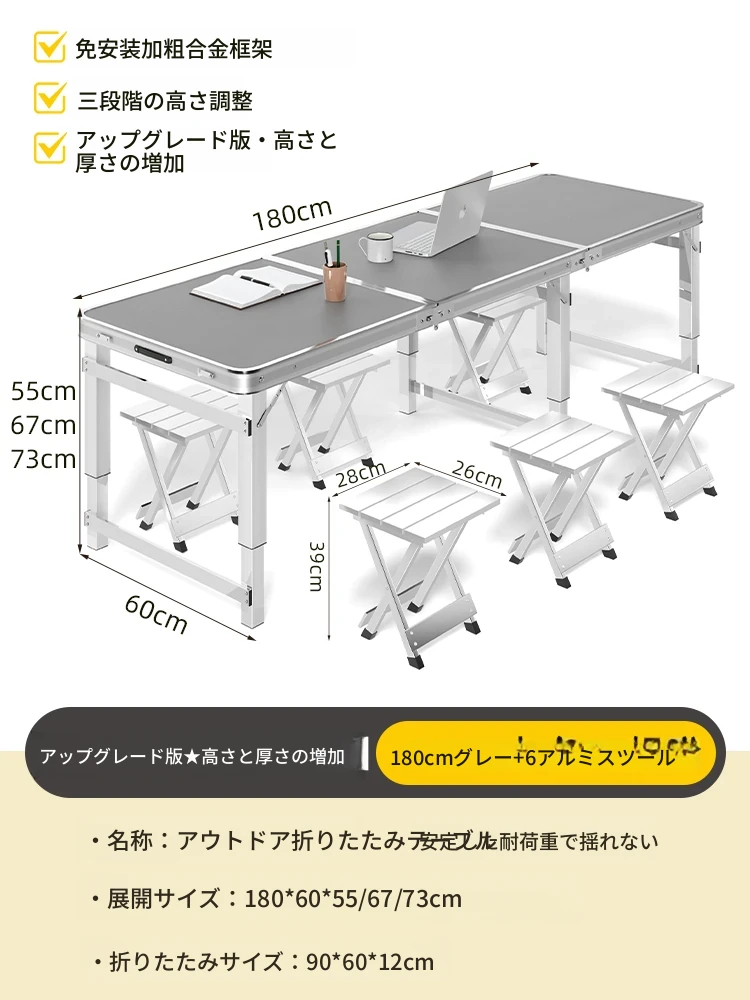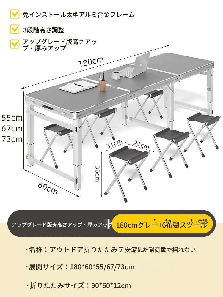 【アップグレード版★高さアップ・厚さアップ】180cmグレー+6アルミスツール