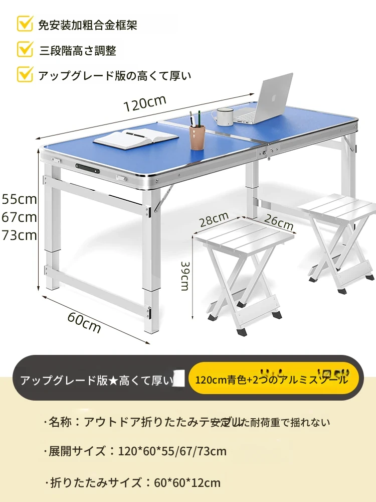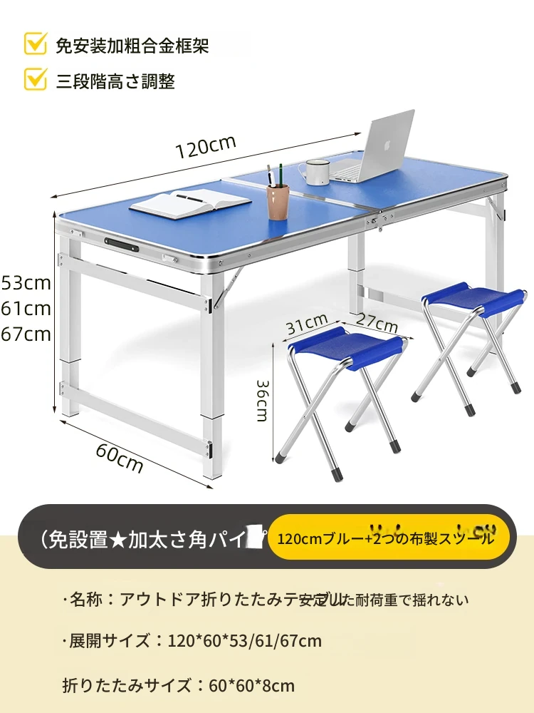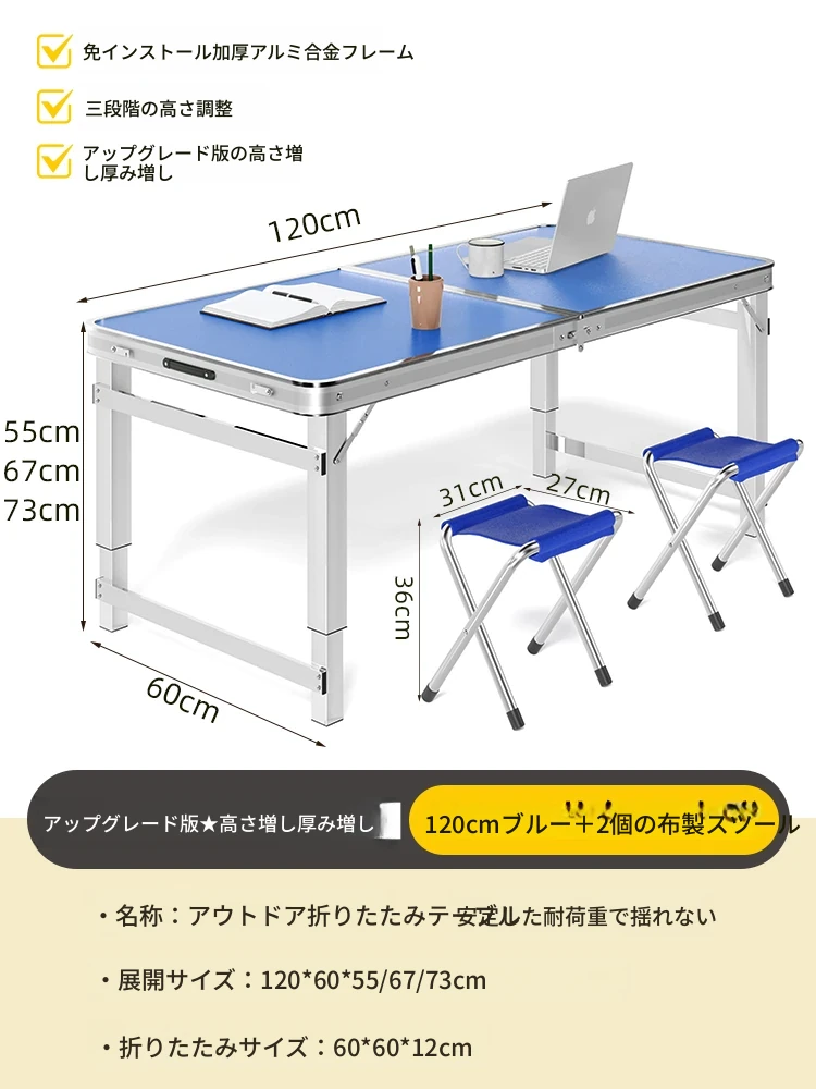 【アップグレード版★高さアップ・厚さアップ】120cmブルー+2アルミスツール