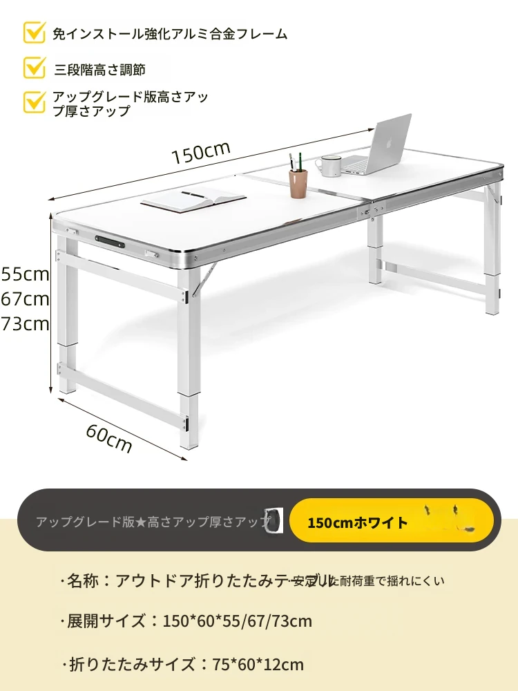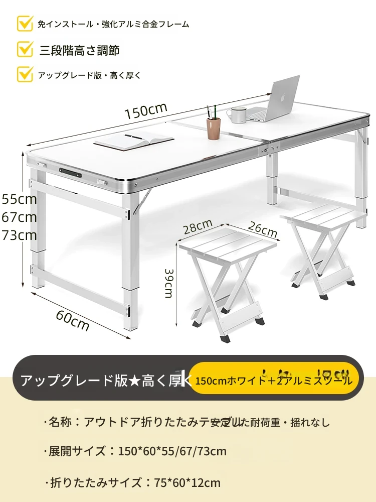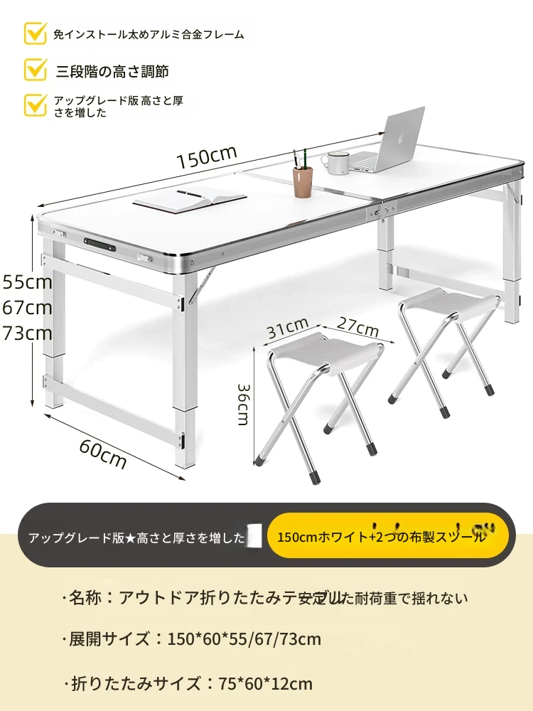 【アップグレード版★高さアップ・厚さアップ】150cmホワイト+2アルミスツール