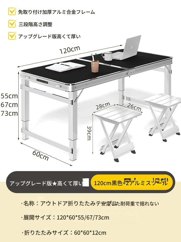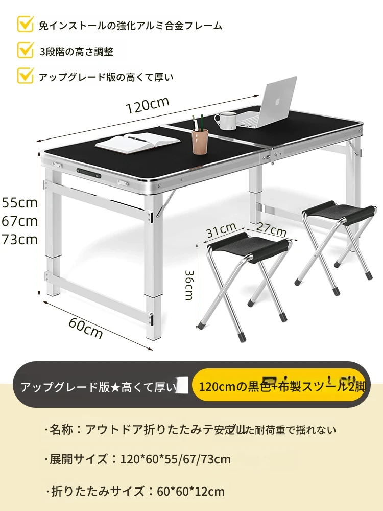 【アップグレード版★高さアップ・厚さアップ】120cmブラック+2アルミスツール