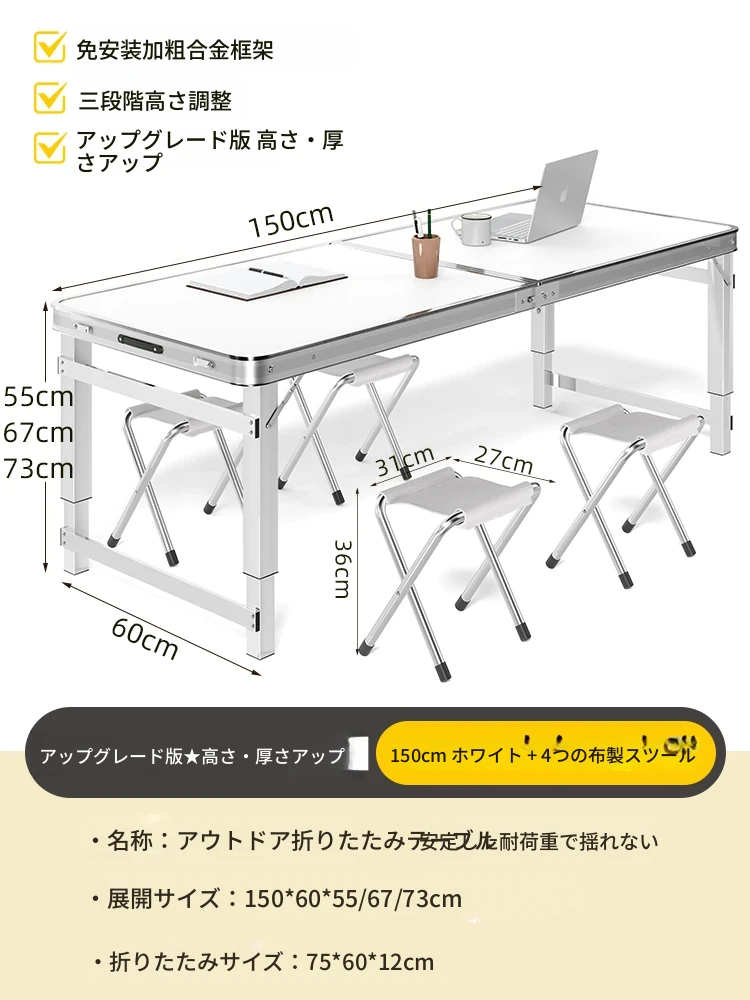 【アップグレード版★高さアップ・厚さアップ】150cmホワイト+4アルミスツール
